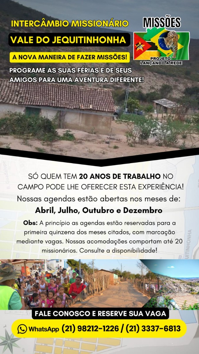 Ao longo desses 18 anos que estamos realizando trabalhos missionários no Vale do Jequitinhonha, notamos que pessoas e igrejas de outras regiões do Brasil desejam viajar conosco para realizar trabalhos nesta região, porém devido a algumas dificuldades, as vezes até por que as nossas caravanas saem do Rio de Janeiro e estas caravanas estão em outros Estados, eles ficam impossibilitados de viajarem conosco. Para que estas pessoas que desejam viajar para o Vale e Receber a assessoria de uma equipe missionária que vive no Vale, criamos o Intercambio Missionário.
